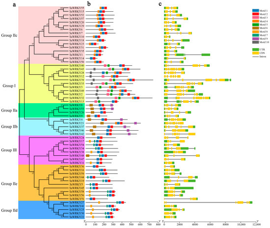 To help clarify the evolution of SsWRKY family genes and their genetic structural diversity, the exon–intron organization of the coding sequences of SsWRKY genes was examined. As is shown in Figure 3c, the number of the exons in SsWRKYs varied from two to seven exons (7 with two exons, 29 with three exons, 8 with four exons, 10 with five exons, 4 with six exons), with SsWRKY21 containing the highest number of predicted exons (n = 7). These results show that the genetic structural diversity among SsWRKY genes may be the result of exon-loss and -gain events during the evolution of the SsWRKY gene family. SsWRKY genes from the same group showed similar exon/intron structures, as in Group IIe. In addition, SsWRKY genes with similar structures clustered together, as in Group III and Group IIe which contained three exons and two introns (or three introns) except for SsWRKY24, SsWRKY11, and SsWRKY36.