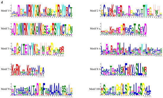 Gene structure and conserved motif analysis of SsWRKY gene family. (a) Phylogenetic tree of SsWRKYs constructed using MEGA7.0 software; (b) Motif compositions of SsWRKY proteins. Ten motifs are represented by different colored boxes numbered 1–10; (c) Exon–intron structural analysis of SsWRKY genes. Green boxes, yellow boxes, and black lines represent UTR, CDS, and introns, respectively; (d) Sequence logos foor motif 1-10.