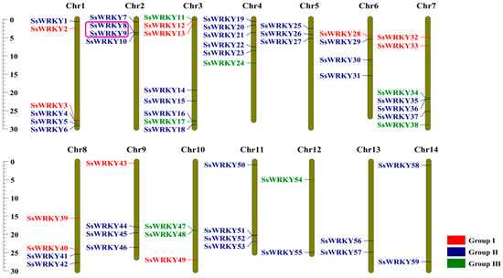 SsWRKY gene distribution across 14 chromosomes of S. siamensis. Tandem duplicated genes are marked with a pink box. Vertical bars represent chromosomes. The different groups of SsWRKY genes are colored red, blue, or green. Base-pair positions are indicated on the left.