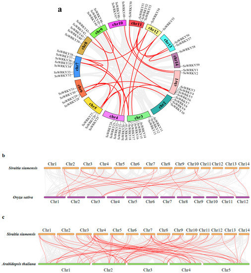 All SsWRKY genes were mapped to the 14 chromosomes of S. siamensis according to their positions on the S. siamensis genome sequence, which was displayed using Circos (http://circos.ca/, accessed on 23 October 2022). Blastp was used to analyze the gene duplication events with default parameters and MCSanX to detect collinearity relationship between S. siamensis and three other species (Oryza sativa, A. thaliana, C. sativus) [63,64].