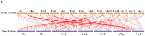 Chromosome-level analysis of the SsWRKY gene family in the S. siamensis genome assembly. (a) Chromosomal location of SsWRKY genes and their collinear relationships are shown in the circle diagram. Gray lines indicate all synteny blocks in the S. siamensis genome, and red lines represent segmentally duplicated gene pairs. Chromosomes 1–9 are denoted by different colors; (b–d) Collinearity analysis of WRKY genes between S. siamensis and O. sativa, A. thaliana, and C. sativus. The syntenic gene pairs of SsWRKY genes are tagged with red lines, and the collinear blocks are presented by gray lines.