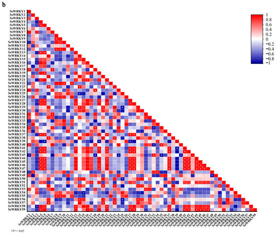 String software was used to construct a protein–protein interaction network of 18 SsWRKY proteins based on the A. thaliana association model. In the interaction network diagram (Figure 7a and Table S2), connected genes might have close functional relationships. The thicker the connecting line, the stronger is the predicted interaction between the two proteins. Among the 18 SsWRKY proteins, there were three proteins from Group I, eleven proteins belonging to Group II, and four proteins in Group III. In addition, SsWRKY53, SsWRKY54, SsWRKY11, SsWRKY12, SsWRKY38, SsWRKY47, SsWRKY3, and SsWRKY39 were shown to have stronger predicted interaction networks with other proteins. These proteins might play a key role in the whole process of WRKY regulation. The results of SsWRKYs co-expression showed that most genes were co-expressed, with the red color representing higher co-expression levels. As shown in Figure 7b, the cluster members SsWRKY4, 5, 27, 28, 41, 42, 44, 45, 46, 47 had high co-expression levels. Among them, the co-expression levels between SsWRKY44-47 and SsWRKY4-5, SsWRKY27-28, SsWRKY41-42 were significantly higher than those among other members.