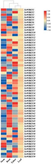 The expression levels of the 59 SsWRKY genes were investigated in four different tissues of S. siamensis (roots, stems, tubers, and leaves), using the S. siamensis transcriptome database (https://dataview.ncbi.nlm.nih.gov/object/PRJNA917212?reviewer=qmfs7mc075pohiv011jqjceh94, accessed on 2 January 2023). All 59 SsWRKY genes were found to have significant expression in at least one tissue, and changes in expression were found between the different tissues surveyed, except for SsWRKY12 (Figure 8). The results showed that SsWRKY genes had the highest expression levels in the roots; 37% (22/59), 31% (18/59), 29% (17/59), and 2% (1/59) of the SsWRKY genes displayed their highest expression levels in roots, tubers, stems, or leaves, respectively. These differences in the expression profiles of the WRKY genes indicate potentially different roles in these tissues.