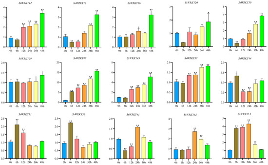 qRT-PCR analysis of SsWRKY genes under cold stress. The Y-axes represent the relative expression and X-axes represent the duration of the cold treatment. Data represents the mean ± SD of three technical repetitions. * p < 0.05, ** p < 0.01.