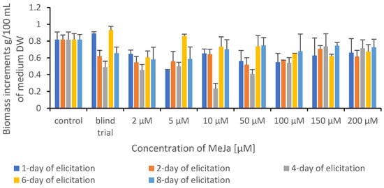 The biomass increase was assessed by measuring the weight of biomass from each elicitation variant. The biomass was harvested after a 10-day growth cycle, drained from the medium, frozen, and lyophilized. A comparison of biomass increment values of control and experimental cultures after elicitation is shown in Figure 2.
