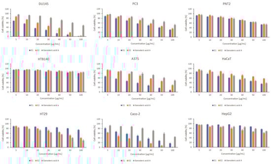 The effect of Ganoderma applanatum extracts on viability of prostate cell line panel—DU145, PC3, and PNT2; skin cell line panel—A375, HTB140, HaCaT, and gastrointestinal tract cell lines panel—Caco-2, HT29, HepG2. Cells were treated with E1—control or extract; E2– extract obtained after elicitation (variant corresponding to the highest concentration of triterpenes) and standard substances: ganoderic acid A (n = 3). Values are presented as the mean ± SD (standard deviation). Significant differences are shown in Tables S1–S3 (Supplementary Materials).