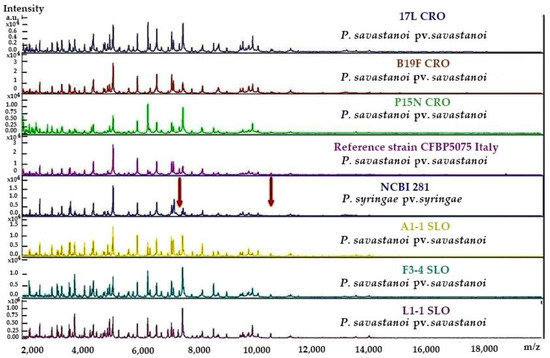 The MALDI–TOF spectra derived from three Croatian Pss strains isolated from olive varieties Leccino (17L), Frantoio (B19F) and Nocciara (P15N) and Pss Slovenian strains isolated from knots on varieties Arbequina (A1-1), Frantoio (F3-4) and Leccino (L1-1) were selected for analysis due to variabilities in the LOPAT scheme test results for these strains (Figure S3). These strains were homogeneous and clearly identified as Pss by the Bruker software, even though the protein profile of P. syringae pv. syringae—the closest genetic relative—was very similar. Typical spectra of some local Pss isolates, along with spectra originating from the Pss reference strain and from P. syringae pv. syringae, are shown in Figure 1, revealing the uniformity of Pss strains and their close resemblance to the P. syringae pv. syringae spectrum. Two small protein peaks—corresponding to approximately 7500–8000 m/z, and between 10,000 to 11,000 m/z—in Pss isolate samples were lacking in the P. syringae pv. syringae strain spectra.