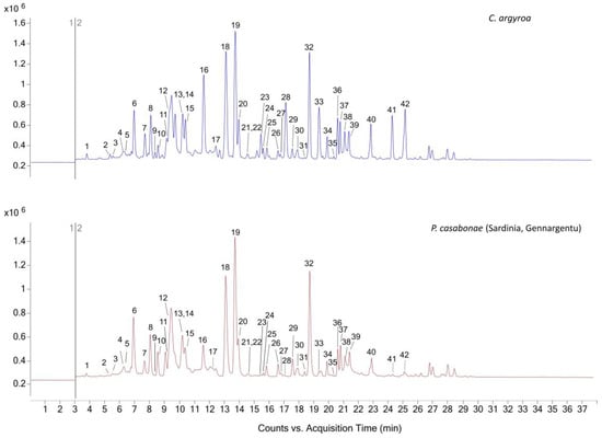 PLS-DA was applied by grouping the samples based on the species for the Carduus genus and on the geographical origin for the P. casabonae samples. The results of this supervised statistical analysis confirmed a slight separation of the P. casabonae samples from the Carduus samples based on the t1 component and a discrimination of C. argyroa from the other species on the t2 component (Figure 3A).