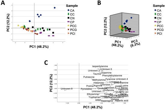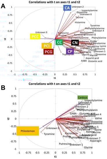 Concerning the PCA, the first, second and third component explain 48.2%, 12.2% and 9.3% of the variability, respectively. The species belonging to the Carduus genus are, with some exceptions, more positively correlated with the first component when compared to the samples belonging to the Ptilostemon genus (Figure 2A,B). Considering the second component (Figure 2A), the species C. argyroa is more separated from the other samples, while the third component does not provide any additional information for the discrimination of the samples according to their amino compound profiles (Figure 2B).