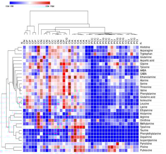 To better estimate the concentrations of these compounds in the investigated samples, a semi-quantitative analysis was performed for all the identified compounds (Table S2). The concentration values were calculated based on a single-point external calibration method. As already discussed, the amino compound content in the Cardueae extracts is characterized by a high variability and these results are supported by the literature data [45,46,47]. In general, all the samples proved to be rich in proline, glutamine, glutamic acid and asparagine. On the other hand, the less abundant compounds were the biogenic amines methylamine, histamine, ethylamine, phenylethylamine and isopentylamine. The quantitative analysis was not performed for BABA due to its co-elution with unknown 5;therefore, not allowing for the accurate integration of its peak. However, the presence of BABA was more evident in the P. casabonae samples. The visualization of the obtained quantitative results in the form of a heatmap graph confirms a clustering of the samples based on their genus of belonging, with few exceptions (Figure 4). Moreover, it is evident that the extracts obtained from the Carduus species show a richer profile and could therefore be considered a better source of amino compounds. A comparison with the literature data shows that the content of some characteristic essential amino acids in the investigated species is comparable to those observed, for example, in Aloe sp., pumpkin andbanana for arginine and strawberry for both valine and phenylalanine [46]. The concentration of other amino compounds that were found in high amounts in the Cardueae extracts, including glutamine, glutamic acid and asparagine, is in line with the literature data on the amino acid content in different types of teas [48], while the proline content is comparable to those observed, for example, in Panax ginseng C.A.Mey., Passiflora incarnata L. and tobacco leaves [31,45]. Concerning the biogenic amines, the histamine content is similar to that found in tomato, pumpkin and pineapple juice [47], while the taurine concentration is similar to the one found in onion bulbs [41].
