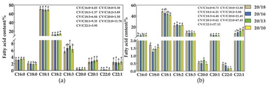(a) Fatty acid content at different nighttime temperatures (WTSL); (b) fatty acid content at different nighttime temperatures (STSL). CV/C16:0, CV/C18:0, CV/C18:1, CV/C18:2, CV/C18:3, CV/C20:0, CV/C20:1, CV/C22:0, and CV/C22:1 represent coefficients of variation (CV) for palmitic acid, stearic acid, oleic acid, linoleic acid, linolenic acid, eicosenoic acid, arachidic acid, docosanoic acid, and erucic acid content in DH0729 and DH0815 in the mature period. CV = SD/Mean × 100%. Lowercase letters were deemed to be statistically significant at p ≤ 0.05.