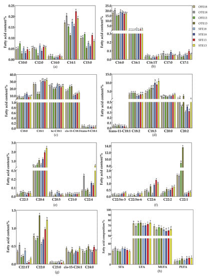 Qualitative and quantitative analyses of medium- and long-chain fatty acids. (a–g) Content of 35 medium- and long-chain fatty acids in the WTSL and STSL during different developmental stages. (h) SFA, UFA, MUFA, and PUFA content in the WTSL and STSL at different nighttime temperatures. OFE18 and OTE18 represent the STSL seeds at the HNT in 35 and 43 DAF, OFE13 and OTE13 represent the STSL seeds at the LNT in 35 and 43 DAF, SFE18 and STE18 represent the WTSL seeds at the HNT in 35 and 43 DAF, and SFE13 and STE13 represent the WTSL seeds at the LNT in 35 and 43 DAF, respectively. C10:0, C12:0, C14:1, C14:0, C15:0, C16:1T, C16:1, C16:0, C17:1, C17:0, C18:2, C18:3, C18:1, 6c-C18:1, cis-11-C18:1, trans-9-C18:1, trans-11-C18:1, C18:0, C20:4, C20:5, C22:3, C20:2, C20:0, C21:0, C22:6, C22:5, C22:5, C22:4, C22:2, C22:1, C22:1T, C22:0, C23:0, cis-15-C24:1, and C24:0 represent capric, lauric, tetradecenoic, myristic, pentadecanoic, palmitelaidic, palmitoleic, palmitic, cis-10-heptadecenoic, heptadecanoic, oleic, linolenic, 6c-octadecenoc, cis-11-octasecenoic, elaidic, trans-11-octasecenoic, stearic, arachidonic, eicosapentaenoic, cis-13,16,19-docosatrienoic, eicosa-11,14-dienoic, arachic, henicosanoic, docosahexaenoic, cis-7,10,13,16-docosatetraenoic, cis-13,16-docosadienoic, erucic, brassidic, behenic, tricosanoic, nervonic, and lignoceric acids, respectively. SFA, UFA, MUFA, and PUFA represent total saturated, unsaturated, monounsaturated, and polyunsaturated fatty acids, respectively. One-way analysis of variance (ANOVA) and Tukey’s post-hoc test were applied to evaluate the significance of fatty acid content changes at different nighttime temperatures. Lowercase letters were deemed to be statistically significant at p ≤ 0.05.