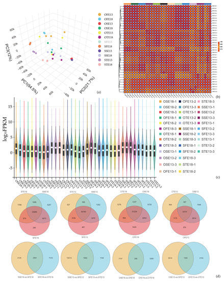 (a) Three-dimensional principal component analysis (PCA) score chart of RNA-seq data for all quality control (QC) samples. (b) Correlation heat map. Pearson’s correlation coefficient (R2) > 0.8 between the three biological replicate samples. (c) Venn diagram of differentially expressed genes (DEGs). Abscissa indicates different samples. Ordinate indicates the logarithmic values of the sample expression FPKM. (d) Venn diagram of differentially expressed genes (DEGs).
