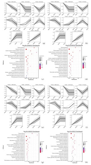 Expression profiles for differentially expressed genes for different nighttime temperature treatments with annotations from the Kyoto Encyclopedia of Genes and Genomes. (a,b,e,f) eight representative expression patterns were screened for eight clusters; (c,d,g,h) enrichment scatter diagram. Black lines were deemed to the trends of genes expression of STSL and WTSL at different nighttime temperatures.