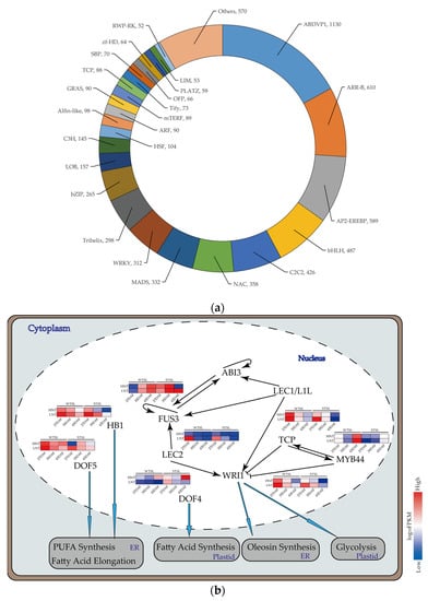 Combined with the GO functional annotation top20 terms, GO:0001071 (nucleic acid-binding transcription factor activity) was enriched in both developing seeds of the WTSL and STSL. Several TFs have been reported to be involved in fatty acid synthesis in B. napus seeds [16,23,24]. In this study, 669 differentially expressed TFs were identified in the WTSL and STSL developing seeds (Figure 5a), of which 113 belonged to the ABI3VP3 family of TFs. ABI3 (LOC106367461), LEC2 (LOC106356333), WRI1 (LOC106412050), DOF5 (LOC106436817), DOF4 (LOC106436165), MYB44 (LOC106390324), TCP (LOC106383098), and HB1 (LOC106430193), involved in fatty acid biosynthesis and oil accumulation, were detected in both the WTSL and STSL developing seeds (Figure 5b), and these TFs played vital roles in fatty acid biosynthesis and oil accumulation. At the HNT, the expression level of WRI1 was higher in the STSL seeds than in the WTSL seeds; however, at the LNT, the expression level was the reverse of that at the HNT. The expression levels of DOF4 and ABI3VP1 were not correlated with the nighttime temperature, and their expression levels were higher in the WTSL than in the STSL, whereas the relative expression levels of TCP and MYB44 were opposite to those of DOF4 and ABI3VP1, being higher in the STSL seeds than in the WTSL seeds. The expression levels of HB1 and DOF5 in the WTSL and STSL seeds grown at the LNT were higher than in seeds grown at the LNT, and these expression level differences were higher in the STSL than in the WTSL seeds. The changes in the expression levels of nine TFs at the HNT and LNT occurred in parallel with the changes in the oil and fatty acid content of seeds, and expression of these TFs may regulate fatty acid metabolism and oil accumulation in B. napus developing seeds at both the HNT and LNT. DOF5 positively regulates fatty acid elongation and PUFA synthesis [25,26,27], while HB21 negatively regulates the expression of SAD, FAD2, and FAD3 [28]. HB1 in B. napus is homologous to HB21 in Arabidopsis thaliana. The differences in the expression levels of DOF5 and HB1 parallel differences in fatty acid content in B. napus plants grown at different nighttime temperatures.