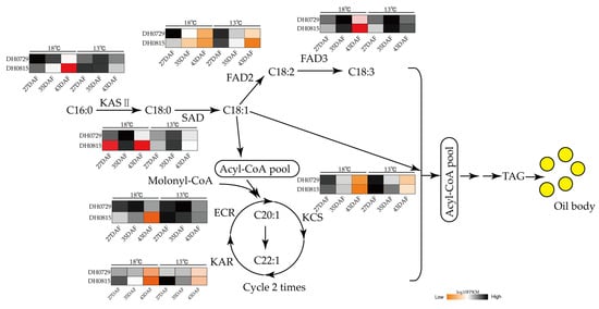 Oil accumulation in seeds is controlled by both genetic and environmental factors (temperature, light, latitude, altitude, etc.). Genetic factors commonly predominate, but environmental factors cannot not be completely ignored [6,7]. For example, temperature plays an important role in the maturation stage. Excessively high temperature affects oil accumulation in seeds, resulting in lower yield and oil content. While low temperatures can improve yield and oil content, excessively low temperatures prolong the whole growth period, affecting overall crop development [6]. A suitable growth temperature not only promotes a high yield but also facilitates oil accumulation, thereby improving the nutritional value of rapeseed. B. napus was planted in agroecological areas at different altitudes [Nanjing (altitude: 8.9 m), Xining (altitude: 2261.2 m), and Lhasa (altitude: 3658 m)]. The oil content was assessed as a function of altitude 35 days after flowering (DAF). With increasing altitude, the oil content increased, and the expression of oil accumulation-related genes was significantly upregulated in seeds [8]. High daytime temperature was not conducive to oil accumulation in seeds, increasing the saturated fatty acid (SFA) content, whereas low daytime temperatures promoted oil accumulation in seeds, increased the content of unsaturated fatty acid (UFA), and promoted fatty acid composition in mature seeds [6]. Fatty acid biosynthesis can be divided into three stages. Firstly, the initial substrate acetyl-CoA is used to synthesize the fatty acids of C16–C18 chains in plastids (de novo biosynthesis and modification of fatty acids). Secondly, transport to the endoplasmic reticulum allows for carbon chain elongation and fatty acid desaturation (carbon chain elongation and fatty acid desaturation). Finally, fatty acids and glycerol are processed into TAGs and storage oils (TAG synthesis) [9]. Fatty acid biosynthesis is controlled by fatty acid metabolism genes (ACC, KAS II, HAD, EAR, KAR, ACP, SAD, FAD2, FAD3, LPAAT, DGAT, PDAT, FAE1, STERO, OBO, OBP, and so on) [10,11,12,13,14,15] and transcription factors (TFs; WRI1, LEC1, LEC2, FUS3, L1L, DOF11, DOF4, and DOF5), and it regulates oil accumulation [16,17,18,19,20]. In sunflower (Helianthus annuus L.) mutants CAS-6 and CAS-14, maximum oleic and linoleic acid content values were obtained at daytime/nighttime temperatures of 39/24 °C and 20/10 °C, respectively [21].