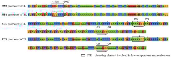 In A. thaliana mutants, HB21 plays an important role in oil accumulation and fatty acid elongation. HB1 is the homologous gene in B. napus. KCS is the main regulatory gene for the elongation of the C18:1-ACP carbon chain to form erucic acid in seeds and thus is heavily involved in changes in the erucic acid content of seeds. The expression of HB1 (LOC106430193) and KCS (LOC106419344) in seeds grown at the LNT was upregulated as determined by RNA-seq, indicating that these genes are regulated by nighttime temperature. Based on these results, the promoter sequences of the four genes were obtained from the B. napus genome database, and their promoter cis-acting elements were predicted by plantCARE. These gene promoters were found to have cis-acting elements involved in LTR. The promoter sequences of HB1 and KCS were cloned from the STSL and WTSL plants (Figure 7, Files S1–S4). In the HB1 promoter, the LTR element has a base mutation (G-C mutation, −1917 bp) in the WTSL that causes loss of sensitivity to low temperatures (Files S1 and S2). In the KCS promoter, a base mutation (A-G mutation, −493 bp) increased the sensitivity of the LTR elements to low temperatures (Files S3 and S4). Therefore, LTR sequence mutations in the WTSL seeds make these genes immune from LNT enhanced sensitivity. As a result, the erucic acid content in the WTSL was not significantly different at the LNT.