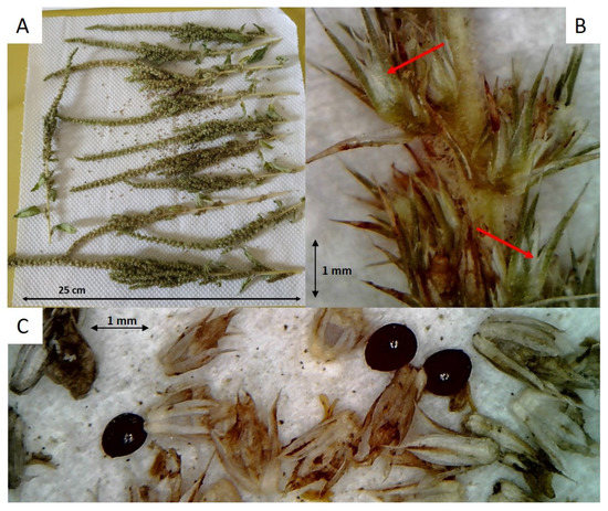 Example of the pictures taken for each of the 51 selected accessions: (A) whole inflorescences, (B) single inflorescences and (C) flowers and seeds. Red arrows indicate a membranous border that, in A. hybridus, stops approximately at half of the bract [8,15].