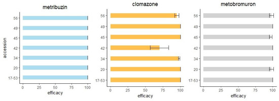 The same six accessions described in Section 2.3.2 (namely, 20, 34, 42, 45, 49 and 56, plus the susceptible check 17–53) were tested with non-ALS herbicides applied in pre-emergence. The results of the two experiments were pooled because the t-test detected no differences between repetitions (p < 0.05). The efficacy of metribuzin was 100% for all accessions, whereas that of metobromuron ranged from 98% to 100% (Figure 4). The fresh weight of the very few plants surviving the metobromuron was 0.2% with respect to the untreated control for accession 20, and less than 0.1% for accessions 45 and 56. The efficacy of clomazone ranged from 95% to 100% for most accessions, except for no. 42 (70%) (Figure 4). Despite the efficacy being lower than that observed for the other accessions, the fresh weight of the survivors was 5.6% compared to the untreated controls.