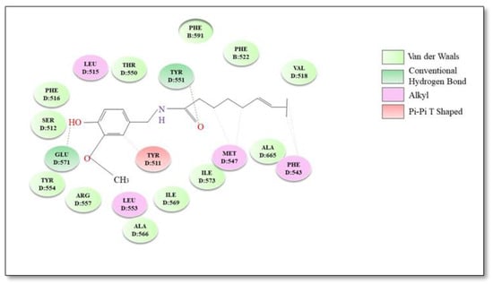 Molecular docking 2D diagram of capsaicin with TRPV1 receptor.