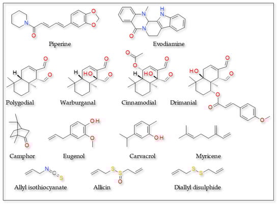 Polygodial and drimanial are unsaturated dialdehydes present in water pepper (Polygonum hydropiper) and the pepper-bark tree (Warburgia salutaris), used in traditional medicine for various effects: analgesic effect and in treating respiratory diseases, diabetes and cardiovascular diseases [110]. Their in vivo systemic administration produces marked antinociceptive, anti-inflammatory and antiallergic effects [111,112,113]. These effects are partly mediated by modulation of TRPV1 receptors, and these compounds inhibit specific resiniferatoxin binding in the rat spinal cord [114]. In cultured rat trigeminal neurons, polygodial and drimanial significantly increased the intracellular Ca2+ levels, an effect that was significantly prevented by capsazepine. However, this effect is dose-dependent: it occurs at low concentrations of ligands, while at high concentrations, Ca2+ uptake is blocked [115].