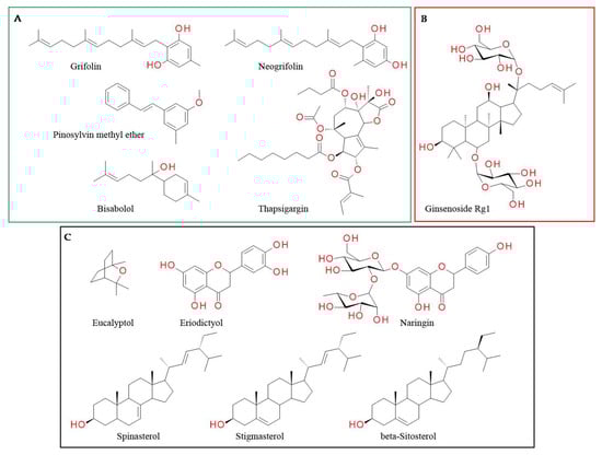 Various flavonoids induced TRPV1-mediated antinociceptive effects, such as reduction in carrageenan-, capsaicin- and chronic complete Freund’s adjuvant (CFA)-induced mechanical and thermal hyperalgesia [164,165,166,167]. Flavonoids with TRPV1 antagonistic properties included various compounds: naringenin [168], cochinchinemin A and B, loureirin B [169], gomisin A [170], eriodictyol [165], quercetin [171] and vitexin [164].