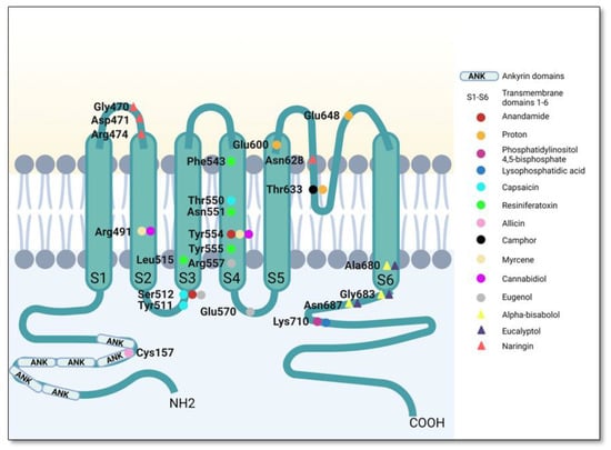 TRPV1 also has a large cytoplasmic domain consisting of two intracellular terminal sequences [76]: the long N-terminal region formed by multiple ankyrin repeats, responsible for the activation of the channel under the action of agonist substances such as capsaicin, resiniferatoxin or high temperature (50 °C) [77], and the short C-terminal region with a role in the stability and function of the receptor [59,68,78,79]. These domains are critical scaffolds for interactions with other proteins. Furthermore, they contain binding sites for regulators of TRPV1, such as calmodulin or ATP [59,79].
