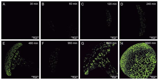 CLSM images of stalked glands of Drosophyllum lusitanicum; 1% FITC BSA treated, after an incubation time of: (A): 30 min, (B): 1 h, (C): 2 h, (D): 4 h, (E): 8 h, (F): 16 h, (G): 32 h, (H): 64 h.