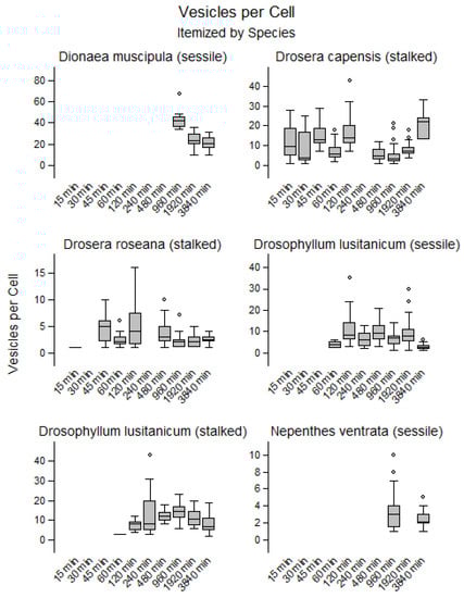 The following supporting information can be downloaded at: https://www.mdpi.com/article/10.3390/plants12020341/s1, Figure S1. Boxplots of vesicle diameters per cell.; Figure S2. Boxplot of vesicle volumes per cell.; Figure S3. Boxplot of corrected brightness of vesicles per cell.; Figure S4. Boxplots of vesicle volumes per gland.; Figure S5. Boxplot of FITC-BSA content per gland.; Figure S6. Boxplot of vesicle volume per trap (DZ); Table S1. Regression analysis itemized by species.