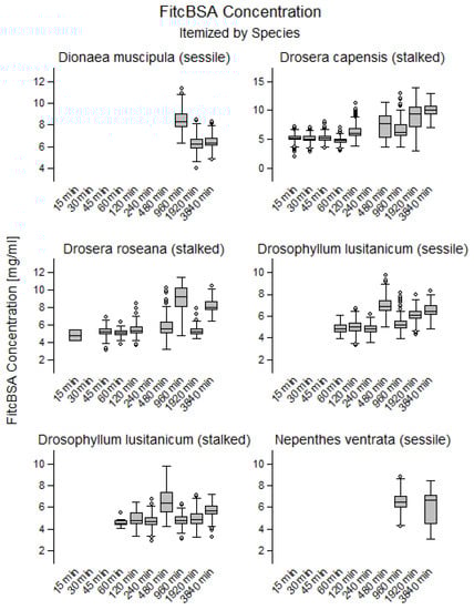 Temporal changes of FITC-BSA concentrations in observed glands in Dionaea muscipula, Drosera roseana, Drosera capensis, Nepenthes × ventrata and stalked and sessile glands in Drosophyllum lusitanicum. Estimated FITC-BSA concentrations within vesicles exhibited a trend toward increase in all species with the exception of N. × ventrata and D. muscipula. The concentrations in N. × ventrata stayed constant, whereas in D. muscipula concentration decreased significantly over time.