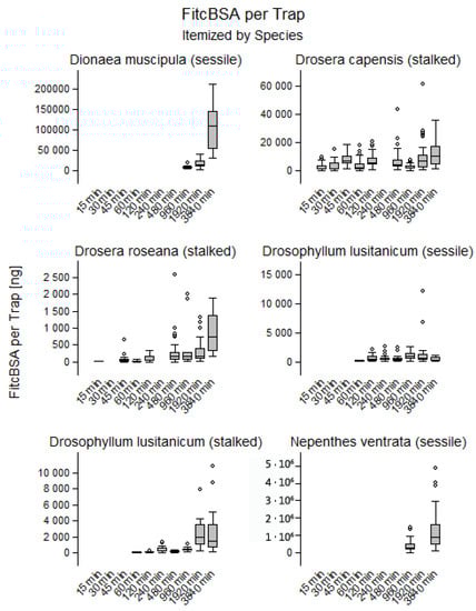 Our standardized approach allowed for quantitative characterization of trends that so far had only been described in qualitative terms. Though qualitative trends were similar in all investigated species, significant quantitative differences were identified. In all adhesive traps, formation of vesicles started rapidly, in less than 15 min in both Drosera species and after 45 min in both the stalked and sessile glands of D. lusitanicum. In Drosera secretion of mucilage or at least water may be an ongoing process [26,27], so that FITC-BSA was taken up as soon as it was available in the medium. The trapping mucilage of D. lusitanicum is much less prone to exsiccation [28] and therefore may not require constant replacement causing a slightly delayed start of endocytosis (60 min). In contrast, similarly to animals [3], D. muscipula and N. × ventrata form temporary stomachs [29,30], where the glands are more or less inactive until prey is trapped [30], which is in good consistency with their observed endocytosis latency of 16 h.