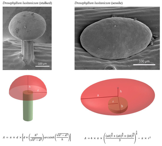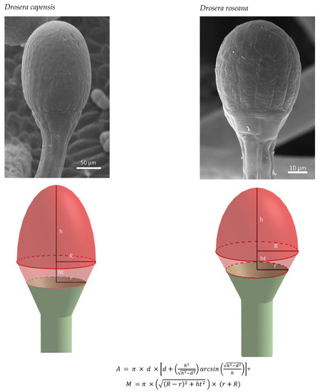 Morphology of the glands illustrated by SEM (Drosera capensis, Drosera roseana) and FESEM (Drosophyllum lusitanicum), their approximation by geometric bodies, and formulas used for calculation of glandular surface areas (visible in shades of red).