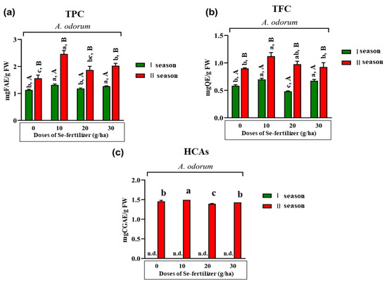 Effect of different doses (control—0, 10, 20 and 30 g per ha) of Se fertilizer and growing season on the total content of free phenolics (TPC): (a) total content of free flavonoids (TFC); (b) and total content of free hydroxycinnamic acid derivatives (HCAs) (c) in the edible parts (leaves) of A. odorum. The bars with (+) standard deviation represent mean values; lowercase letters indicate comparisons between treatments (applied doses of Se-fertilizer (g/ha)); uppercase letters indicate comparisons between seasons; different letters indicate statistically significant differences according to Tukey’s HSD test (p < 0.05). n.d.—not detected; FAE—ferulic acid equivalents; QE—quercetin equivalents; CGAE—chlorogenic acid equivalents.