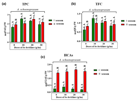 Effect of different doses (control—0, 10, 20 and 30 g per ha) of Se fertilizer and growing season on the total content of free phenolics (TPC) (a), total content of free flavonoids (TFC) (b) and total content of free hydroxycinnamic acid derivatives (HCAs) (c) in the edible parts (leaves) of A. schoenoprasum. The bars with (+) standard deviation represent mean values; lowercase letters indicate comparisons between treatments (applied doses of Se-fertilizer (g/ha)); uppercase letters indicate comparisons between seasons; different letters indicate statistically significant differences according to Tukey’s HSD test (p < 0.05). n.d.—not detected; FAE—ferulic acid equivalents; QE—quercetin equivalents; CGAE—chlorogenic acid equivalents.