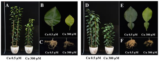 The effects of Cu toxicity on seedling growth (A,D), leaf morphology (B,E) and root development (C,F) of two citrus species (C. sinensis: (A–C); C. grandis: (D–F)).