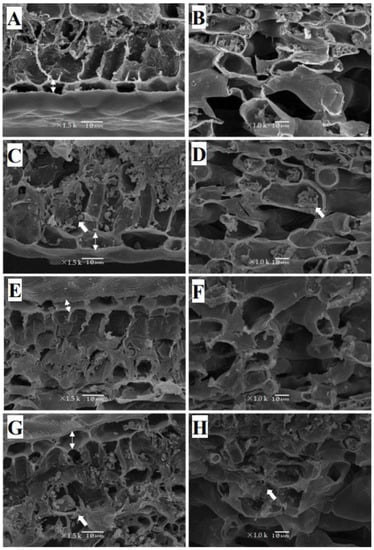 The SEM images of 0.5 µM (A,B,E,F) and 300 µM Cu-treated (C,D,G,H) leaves of two citrus species. C. sinensis: (A–D); C. grandis: (E–H). Images (A,C,E,G) show epidermis and palisade tissues of citrus leaves. Images (B,D,F,H) show the spongy tissue. The granules in cells labeled by arrows are starch granules. The two-way arrow represents the average thickness of the leaf epidermis. The scales in the figures represent 10 μm.