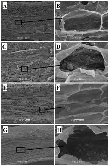 The cell layer in the root exodermis of control C. sinensis was well-structured in the transversal and longitudinal sections under SEM (Figure 3A and Figure 4A). The distorted vessels and impaired structure at the cross-section of C. sinensis roots were found under Cu toxicity (Figure 3C). The xylem of control C. sinensis was almost empty (Figure 3B and Figure 4B). However, the cross-section of the root xylem was covered by flocculent precipitate under Cu toxicity in C. sinensis (Figure 4D). Increased accumulation of starch granules was observed in roots of excessive Cu-treated C. sinensis (Figure 3D). Compared with C. sinenis under control, C. grandis had a thicker xylem and the inner ring was clear (Figure 4E,F). The accumulated starch granules, disrupted vessels and flocculent precipitate at the longitudinal section were also found to be in excess of Cu-treated C. grandis (Figure 3H and Figure 4H). Compared with C. sinensis under Cu toxicity, C. grandis had a more apparent flocculent precipitate on the cross sections under SEM.