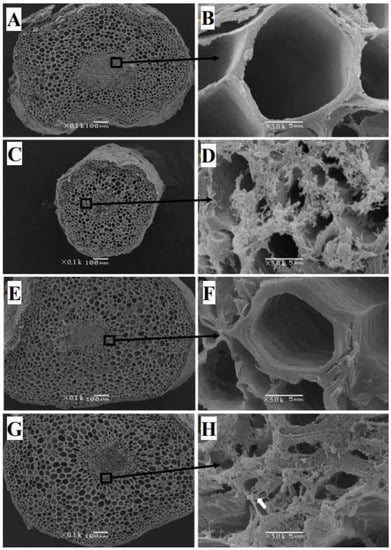 The SEM images of cross-section of 0.5 µM (A,B,E,F) and 300 µM Cu-treated (C,D,G,H) roots of two citrus species. C. sinensis: (A–D); C. grandis: (E–H). The right figures are partial enlargements of the left figures. Images (A,C,E,G) show epidermis, exodermis, cortex, endodermis, pericycle, xylem and phloem. Images (B,D,F,H) show the xylem of the roots. The arrows represent the blocked xylem of roots by flocculent precipitate in (D) and (H). The scales in figures (A,C,E,G) represent 100 μm. The scales in figures (B,D,F,H) represent 5 μm.
