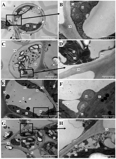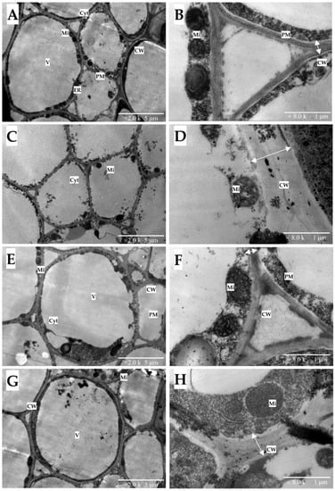 The TEM images of 0.5 µM (A,B,E,F) and 300 µM Cu-treated (C,D,G,H) roots of two citrus species. C. sinensis: (A–D); C. grandis: (E–H). CW: cell wall; Cyt: cytoplasm; ER: endoplasmic reticulum; Mi: mitochondrion; PL: plasmalemma; V: vacuole. The two-way arrow represents the average thickness of the cell wall. The scales in figures (A,C,E,G) represent 5 μm. The scales in figures (B,D,F,H) represent 1 μm.