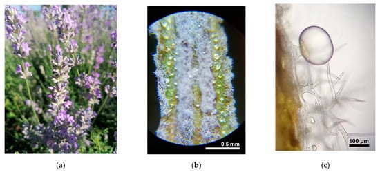 Aspects of Lavandula angustifolia ‘Sevtopolis’, one of the frequently cultivated genotypes in Eastern Europe: (a) inflorescence; (b) glandular trichomes located in the calyx grooves and branched trichomes with protective role, magnified 160×; (c) microscopic sideview of a glandular trichome and branched protective trichomes in the background, magnified 400× (original photos by Ioana C., 2022).