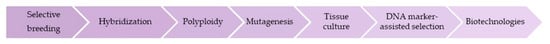 The modern lavender breeding programs have their beginning in France, and were established later also in Eastern Europe [23], United Kingdom and then worldwide [7]. At first, lavender breeding programs were based on testing, selection and multiplication of the best-performing plants. Then, the breeders conducted hybridization programs between different varieties to explore the effect of heterosis [82]. In Eastern Europe, some locally adapted lavender cultivars were obtained by using a polycross hybridization scheme [83]. Other methods employed by breeders include experimental polyploidy and mutagenesis. Nowadays, targeted breeding is increasingly necessary to optimize lavender improvement programs, and this is now possible due to lavender genome sequencing [23]. Breeding methods used to create new genotypes of lavender are presented in Figure 2.