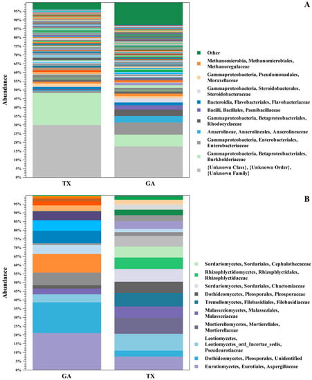 16S and ITS OTU Clustering. Relative abundance of bacterial (A) and fungal (B) populations in seedlings of pecan grown from seed of the same controlled ‘Lakota’ × ‘Oaxaca’ cross from trees in Texas (TX) and Georgia (GA). The stacked bar chart shows OTU clustering at the level of taxonomic family of the bacterial and fungal microbial communities associated with the seedlings from the Georgia and Texas seed samples.