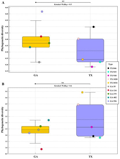 Phylogenetic alpha diversity analysis of the bacterial communities identified in the ‘Lakota’ × ‘Oaxaca’ seedlings revealed no statistical differences between the seedlings from seed of the parent trees in Georgia when compared to those seedlings from seed of the parent tree in Texas (Figure 2A). Phylogenetic alpha diversity analysis of the fungal communities identified followed a similar pattern to those of the bacterial communities (Figure 2B). The individual seedling samples from each state, respectively, indicate a homogenic relationship for both bacterial and fungal analyses. Based on the Mann–Whitney and Kruskal–Wallis analyses for both the bacterial and fungal diversities associated with the pecan seedlings from the Texas and Georgia crosses, p values indicated a lack of evidence for differences in alpha diversity (bacterial p = 0.5 and fungal p = 0.6).