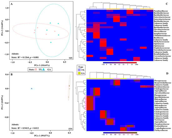 16S and ITS Beta Diversity. PCoA visualization of bacterial (A) and fungal (B) populations in seedlings of pecan grown from seeds of the same controlled ‘Lakota’ × ‘Oaxaca’ cross from trees in Texas (TX) and Georgia (GA). The colored shapes represent samples from their respective state (red circle represents Texas and the blue triangle represents Georgia). Heat map visualization of bacterial (C) and fungal (D) beta diversity in seedlings grown from seeds of the same controlled ‘Lakota’ × ‘Oaxaca’ cross from trees in Texas (TX) and Georgia (GA). Here we show the 25 most abundant OTUs with their taxonomic assignment at the family level.