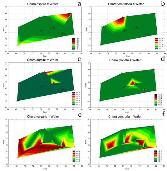 Statistical maps for Chara species distribution on the studied area of south and southeast Kazakhstan in 2019–2022. Chara aspera (a); Chara tomentosa (b); Chara domini (c); Chara globata (d); Chara vulgaris (e); Chara contraria (f). The legend key shows the species relative value.