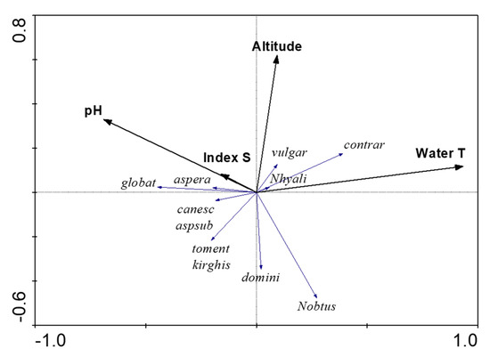 There are species that are highly influenced by pH, temperature, and altitude, while organic pollution (Index S) is not an important factor for regulating species distributions (Figure 5). RDA shows that pH and altitude are negatively correlated to Nitellopsis obtusa’s distribution, but higher water temperatures are positively correlated. Increasing site altitude and water temperatures were positive influences for Chara contraria. At the same time, the habitat altitude is a negative factor for the rare species Chara tomentosa, C. kirghisorum, and C. dominii’s distributions. For the other species, the RDA does not indicate specific influencing factors.
