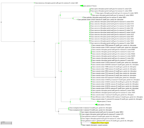 Figure 6 demonstrates high similarity of matK sequences of Chara vulgaris samples from the Kakpatas River (yellow) with other populations of C. vulgaris from NCBI. It confirms the identity of C. vulgaris according to morphological traits only from different habitats, which includes NCBI data in the tree that is very closely related to our data.