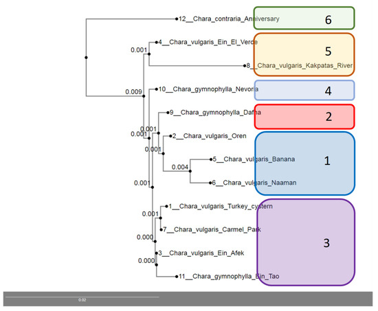 The phylogenetic tree presents a high similarity of matK sequences for Chara contraria, C. vulgaris, and C. gymnophylla samples from the south and southeast Kazakhstan and Israel sites in Figure 8. There are a few clusters with high similarity of sequences shown in Table 1. Most similar were populations of C. vulgaris from Mediterranean coastal zone with high salinity and pH (Table 1). C. vulgaris populations from Oren can be included in cluster 1 too. C. gymnophylla was a slightly different form from northern Israel (Dafna) that is in cluster 2. Cluster 3 combined C. vulgaris populations from Carmel Mountain Biosphere Reserve and Ein Afeq Natural Reserve, Israel and C. gymnophylla from the Upper Jordan River valley habitat Ein Tao. High mountain habitat Nevoria in northern Israel included C. gymnophylla in cluster 4. C. vulgaris from Kakpatas River in Kazakhstan and Ein El Verde from the mountainous region of northern Israel was grouped into cluster 5. The last, significantly different cluster 6 included only one population of C. contraria from the Lake Anniversary in Kazakhstan.