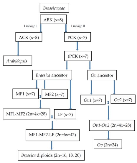 In the previous molecular phylogenetic tree, O. violaceus seemed to form a unique clade and was called the floating genera together with some other crucifers [9]. Based on the genome comparisons among O. violaceus and 12 other sequenced Brassicaceae species and the phylogenetic tree constructed, O. violaceus was found to be close to Brassica and Schrenkiella parvula in Brassicaceae lineage II but distant from Arabidopsis (lineage I) [7,8] (Figure 1). However, no genomic evidence supported that it was descended from the tetraploid intermediate Brassica ancestor, indicating their independent evolutionary paths [8].