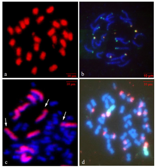 - Li, Z.Y.; Cartagena, J.; Kukui, K. Simultaneous detection of 45s and 5s rDNA genes in Orychophragmus violaceus by double fluorescence in situ hybridization. Cytologia 2005, 70, 459–466. [Google Scholar] [CrossRef]